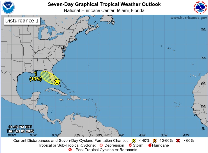 O Centro Nacional de Furacões dos Estados Unidos (NHC) informou nesta quinta-feira (2) que acompanha uma área de instabilidade atmosférica no Atlântico Sudoeste, próxima ao noroeste das Bahamas e ao sul da Flórida.