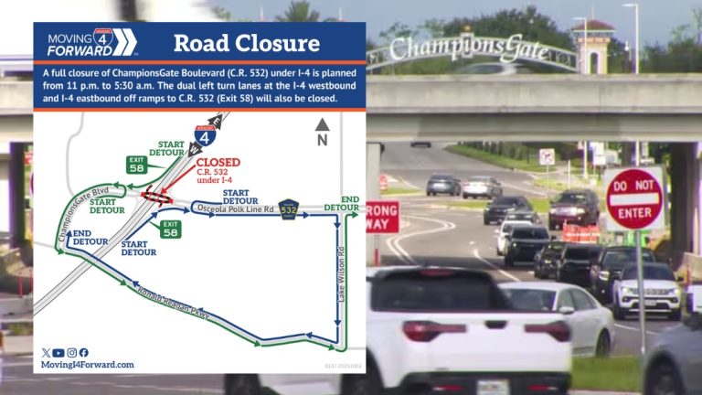 Motoristas devem seguir rotas alternativas entre os dias 13 e 15 de outubro na região de Kissimmee e ChampionsGate O