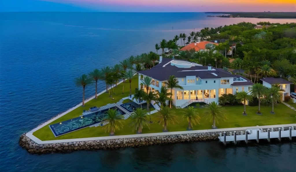 A propriedade de 18.000 pés quadrados à beira-mar ostenta uma localização privilegiada em uma península única em forma de V, 574 pés de frente para a Baía de Biscayne, um cais privativo de 200 pés, uma piscina enorme e comodidades elevadas por toda parte.