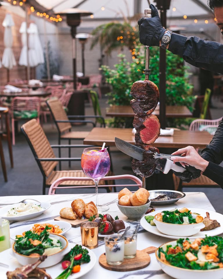 Inclui o tradicional serviço tableside, com cortes preparados por chefs gaúchos e servidos diretamente na mesa, acompanhados de Farm Table e acompanhamentos quentes e frios.