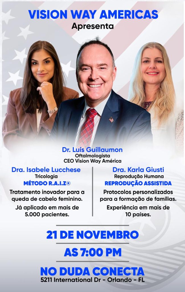 A medicina brasileira segue expandindo suas fronteiras e alcançando novos espaços nos Estados Unidos. No próximo dia 21 de novembro, a Vision Way Americas promoverá um encontro especial em Orlando reunindo dois grandes nomes da saúde brasileira, em uma noite dedicada à inovação, conhecimento e internacionalização da medicina.